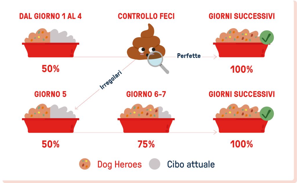 Il protocollo che consigliamo ai nostri nutrizionisti veterinari è semplice: inizia con il 50% Dog Heroes e il 50% della dieta precedente per 2–4 giorni, tenendo i due alimenti separati ai pasti. Se le feci sono perfette, passa al 100%. Se sono un po’ molli, mantieni il 50/50 per altri 4 giorni prima di fare il salto.